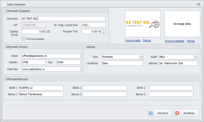 Primul pas dupa crearea contului dvs. este de a seta datale societatii. Cu exceptia codului fiscal toate datele se pot modifica in orice moment doriti.
